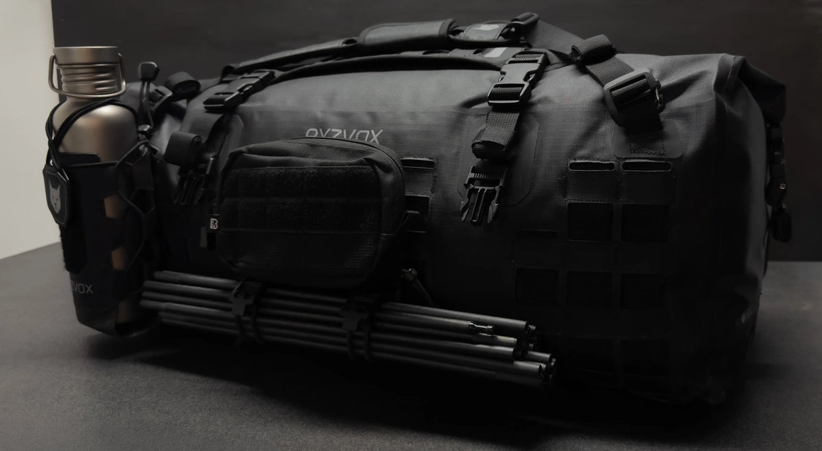 Na vnějšku tašky najdete naši MOLLE-inspirovanou úchytnou mřížku. Připevněte držáky lahví, přídavná pouzdra nebo tašku proměňte v batoh díky volitelným popruhům.